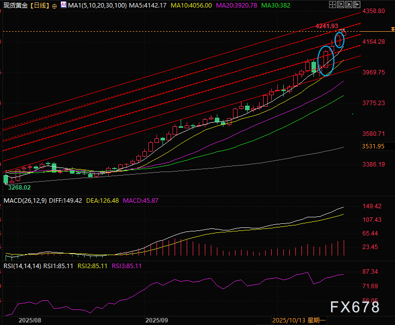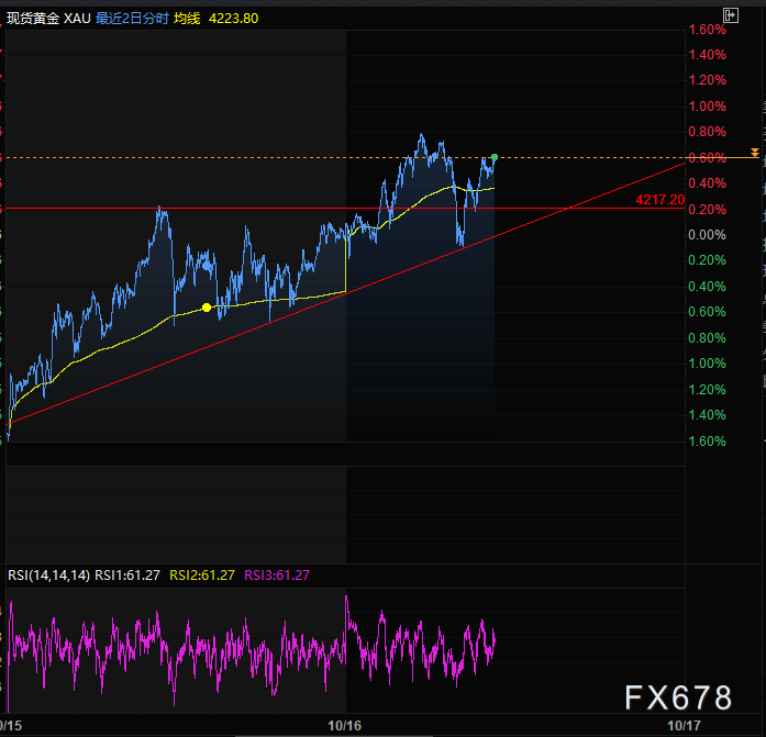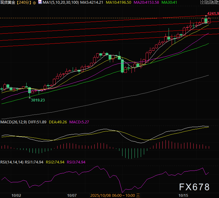 杏宇平台——现货黄金自周四(10月16日)亚洲时段触及的历史新高4241后快速回落约0.7%,但在利好的消息支撑下又反弹回起跌位置,目前涨0.58%交投于4232附近,仍连续第五个交易日维持看涨基调。