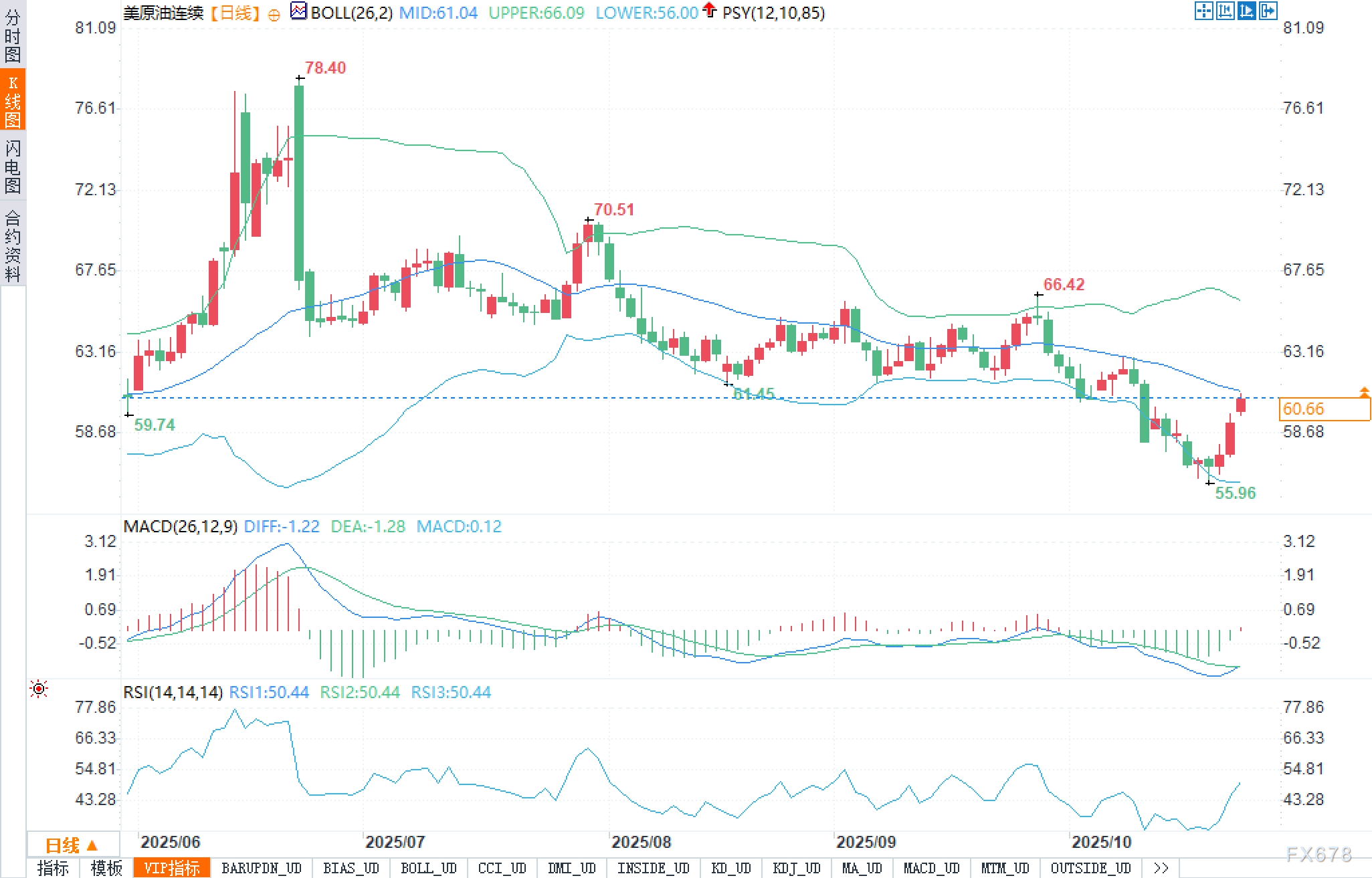 从日线图看,布林带参数BOLL(26,2)显示:中轨61.04、上轨66.09、下轨56.00。价格在55.96低点附近与布林下轨形成双重支撑后反抽逼近中轨61.04。