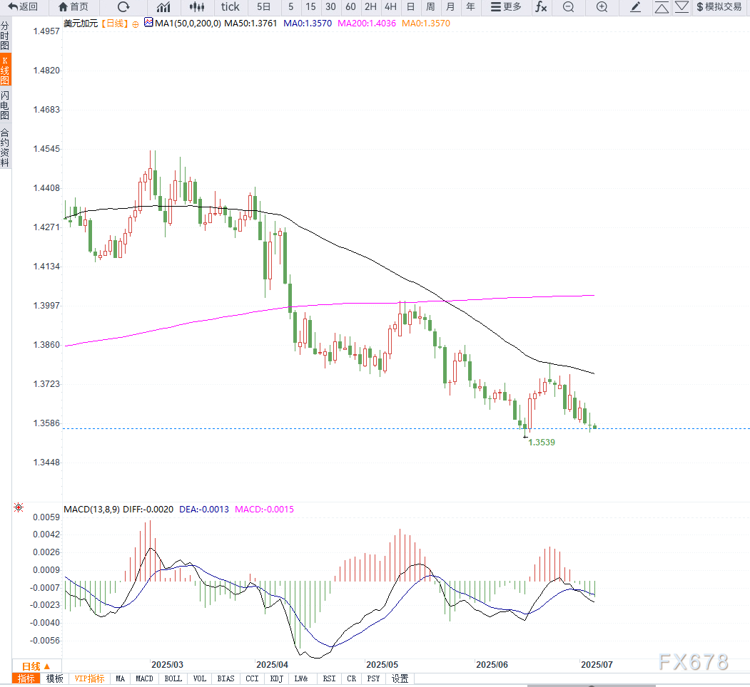 下方关键支撑位位于1.3540(6月16日低点),若有效跌破,将打开进一步下行空间,目标位可能指向1.3500心理关口及1.3420的去年9月25日低点。